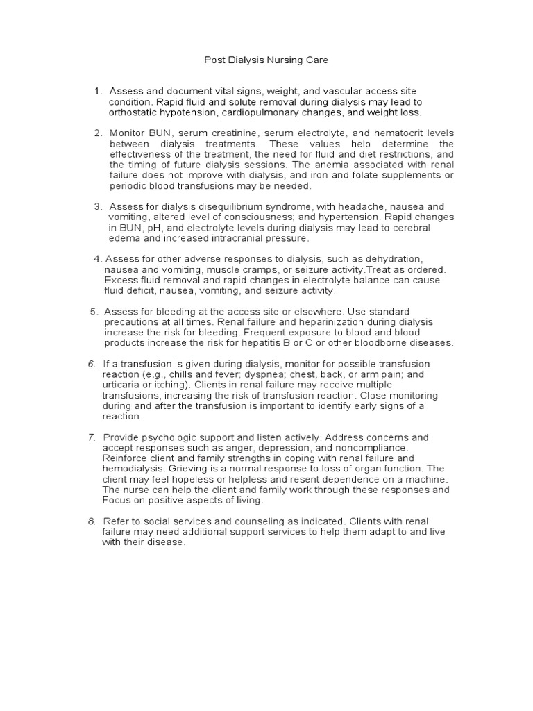 Measure all sources of IO. Here are three 3 nursing. Abstract Critical care nurses see patients who may potentially develop dialysis disequilibrium syndrome in a variety of settings including pediatric neurologic and multispecialty intensive care units. How should patients with dialysis disequilibrium syndrome be managed. Early recognition and intervention are essential to prevent the potential deadly effects of this disorder and improve outcomes for. The dialysis disequilibrium syndrome DDS is a clinical constellation of neurologic symptoms and signs occurring during or shortly following dialysis especially when dialysis is first initiated. Aids in evaluating fluid status when compared with weight. More serious symptoms can result in seizures and coma. Nursing care planning and goals for patients who are undergoing hemodialysis include monitoring of the AV shunt patency during the process preventing risk for injury monitoring fluid status and providing information.