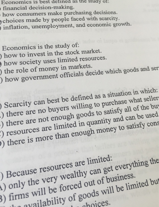 Economics is best defined as the study of how people businesses governments and societies A make choices to cope with scarcity. Economics can be defined as the study of scarcity. Choices made by people faced with scarcity. Which of the following statements best describes the purpose of the production possibilities curve. Your opportunity cost of going to a movie is A- the price of the ticket. Cchoose abundance over. Economics is best defined as the study of. Inflation unemployment and economic growth. Economics is best defined as the study of.