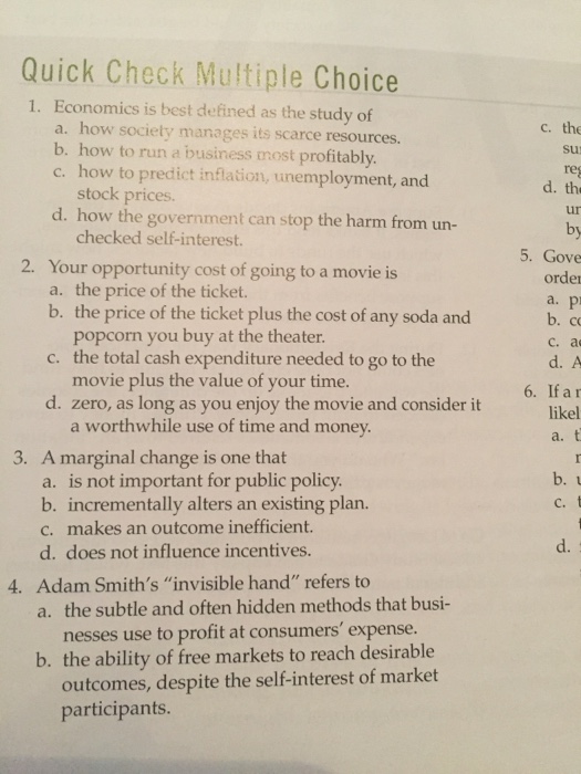Your opportunity cost of going to a movie is A- the price of the ticket. Economics is best defined as the study of. How society manages its scarce resources.