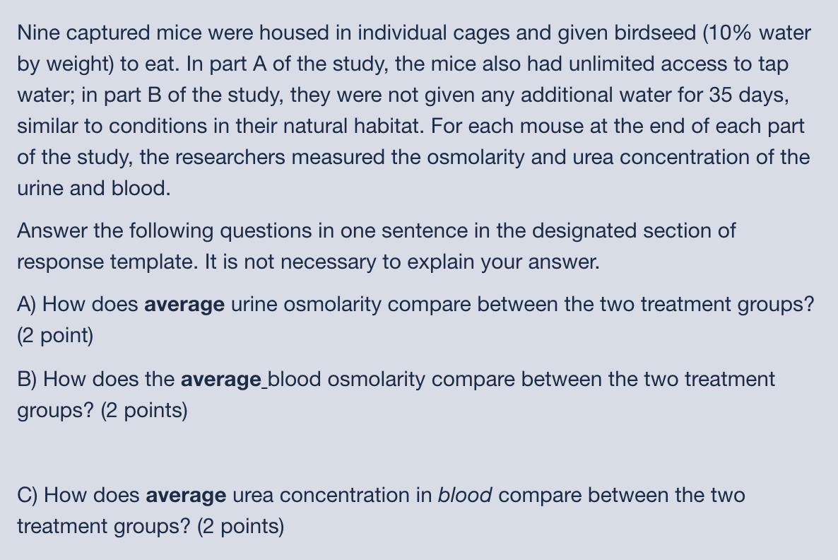 For mice with unlimited access to water what is the ratio of urine osmolarity to blood osmolarity. Biology 0 1452 users searched for this homework answer last month and 97 are doing it now lets get your homework done.